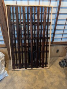 過日、蔵の入口に野ざらしにな定る”格子戸”を発見。ここはできるだけ元に戻せればよいと思い作業をしています。何でも捨てずに置いておくことは町家維持のためには大切です。