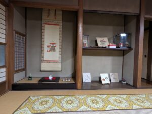 表の格子戸の一部に入口があります。場所は建物の鬼門。これは家業廃業後にテナント貸をした名残りです。いろいろあってここに門口を設けたのでしょうが、鬼門に当たりますので元に戻せればと考えていました。