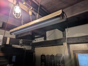 倉庫に比較的新しい蛍光灯があったので交換することにしました。脚立で簡単に交換できるだろうと思っていたら、ホコリが綿のように積もり触ると舞い上がります。雑巾や箒でまずはほこりを落としてから、接続部を見ると鋳物製、初めて見る代物です。中を見るとマイナスネジで結束している。最近はローゼットやシーリングといった簡単に取り付けられるものに慣れているので面食らいます。総取替えは味がないので、できるだけ使えるものは活かして取り付けることにしました。