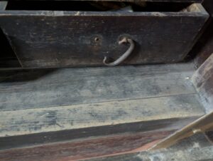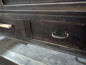 三か所あり金具が残っているのは写真の1個のみ。菊座の金具は弱いのだろうか?引出しを開けてみると、中には金属の工具類が沢山入っています。重たいものは使用禁止にしないとこれから先何時までもつやら。
