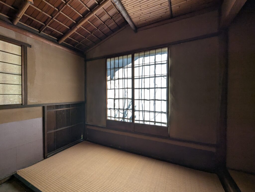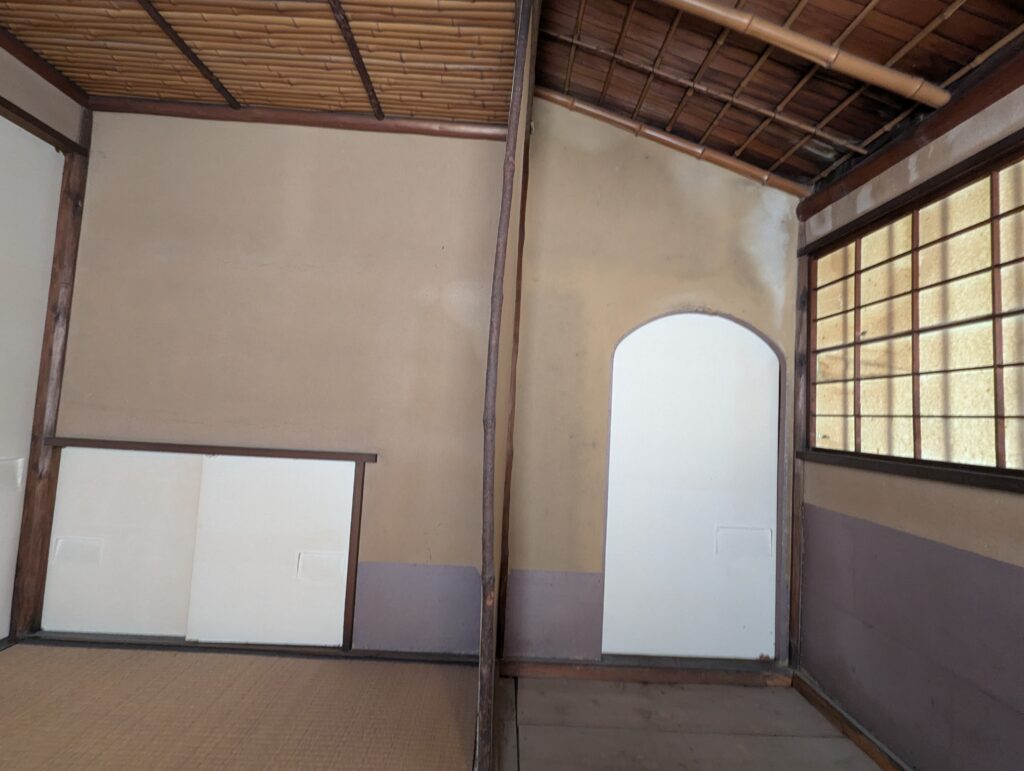 建具の調整は、ほぼ全ての扉が問題を抱えていました。「躙り口」の扉は部材がないので後日、障子戸は鴨居が落ちていてビクともしない状態なので後日ジャッキアップします。以前軒が腐食から下がったのでつっかい棒を立てています。窓が開かないのはその影響が大きいのではないだろうか。
