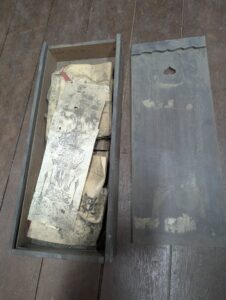 見つかった木箱のお札は歴史遺産として取っておきましょう。