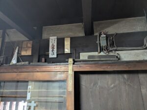 入口いある大戸のガラス戸に鍵をつけようと作業している中で面白いものを発見しました。お札を入れる木箱なのですが堆積したホコリの山の中に埋もれており掘り出してみると箱書きがあります。