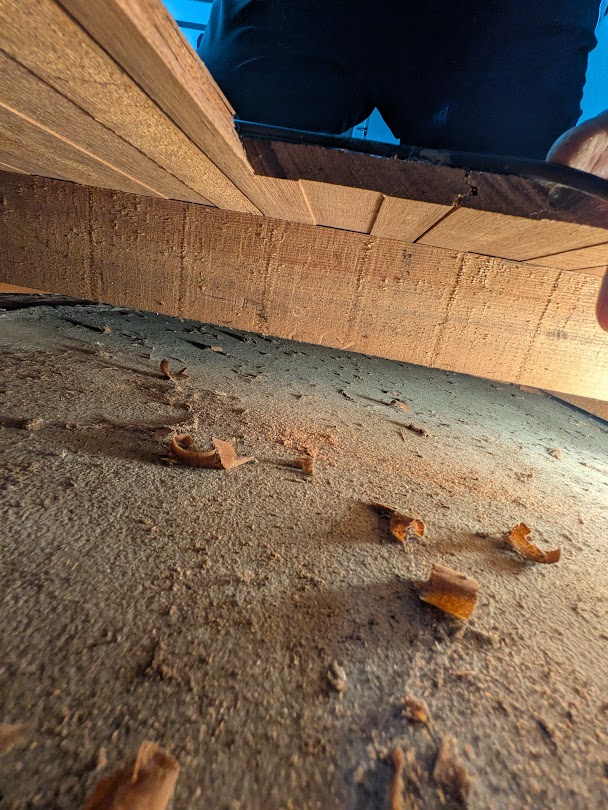 この木は軒を支える桔木(はねぎ)というものではないか?左側を見ると壁板も綺麗に残っています。ということは化粧べニアを剥がすと地が出てくると言うことになります。