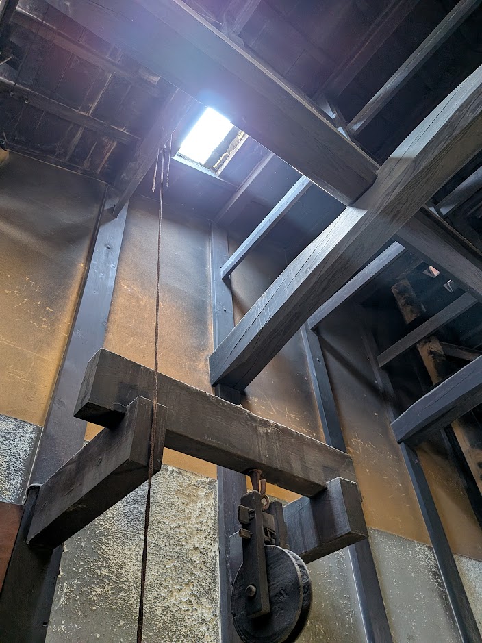 確か真直ぐ伸びている紐を引くと開くはずですが、古い紐を引くと千切れるかもしれないので触れません。また、力づくで開いても破損すれば雨漏りするだろうし、修理するのは大変です。