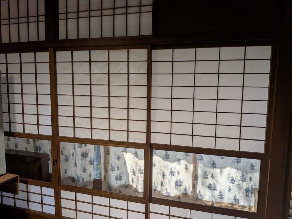 ところが障子の数が多い。座敷だけでなく縁側のガラス戸の上も「はめ殺しの障子」です。そして、メインの障子戸は間にガラス窓がはめてあり、下段にも障子があります。