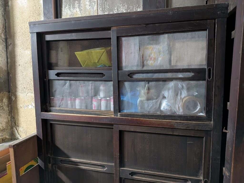 ハシリにある水屋の戸網が朽ち果てて紙で応急処置されています。
