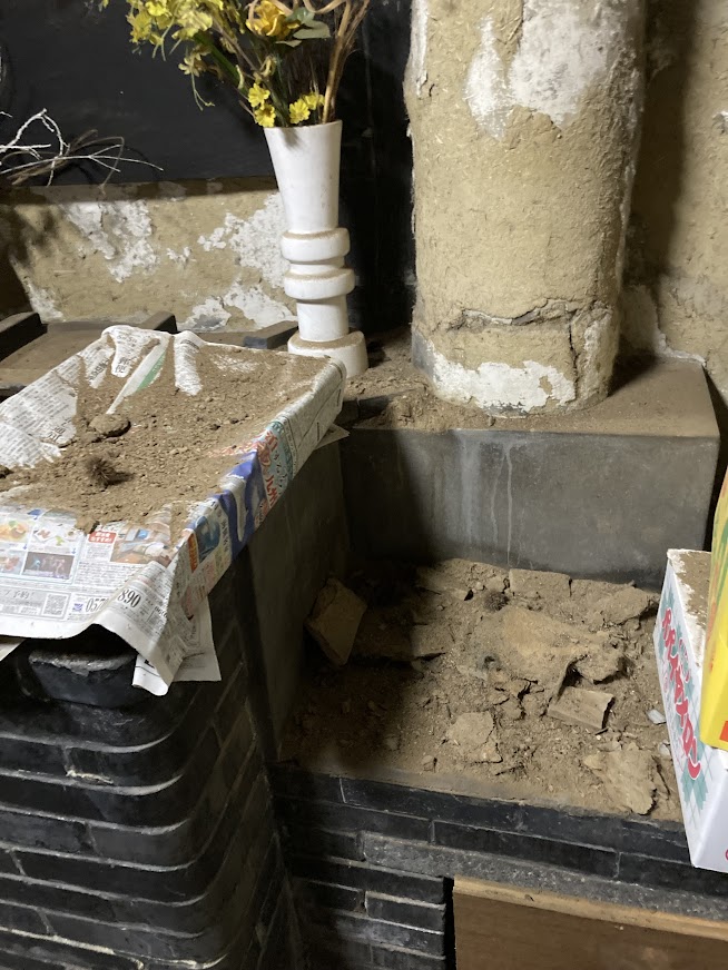 落下物を清掃しながらよく見てみると煙突の一部の様なものがあったり、瓦の破片があったり、多くは土壁の砂のようです。