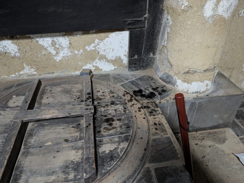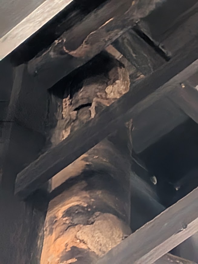 この煙突、外のキャップが無くなり雨水が吹き込み、ところどころひび割れがありました。屋根の木部を見ると水が沁みている跡が残っています。大屋根の修理もしっかりしないと不味いことが分かります。