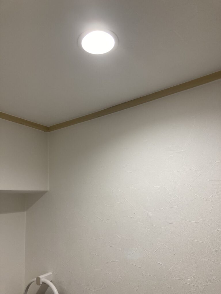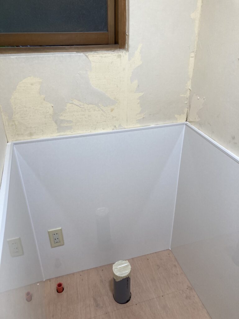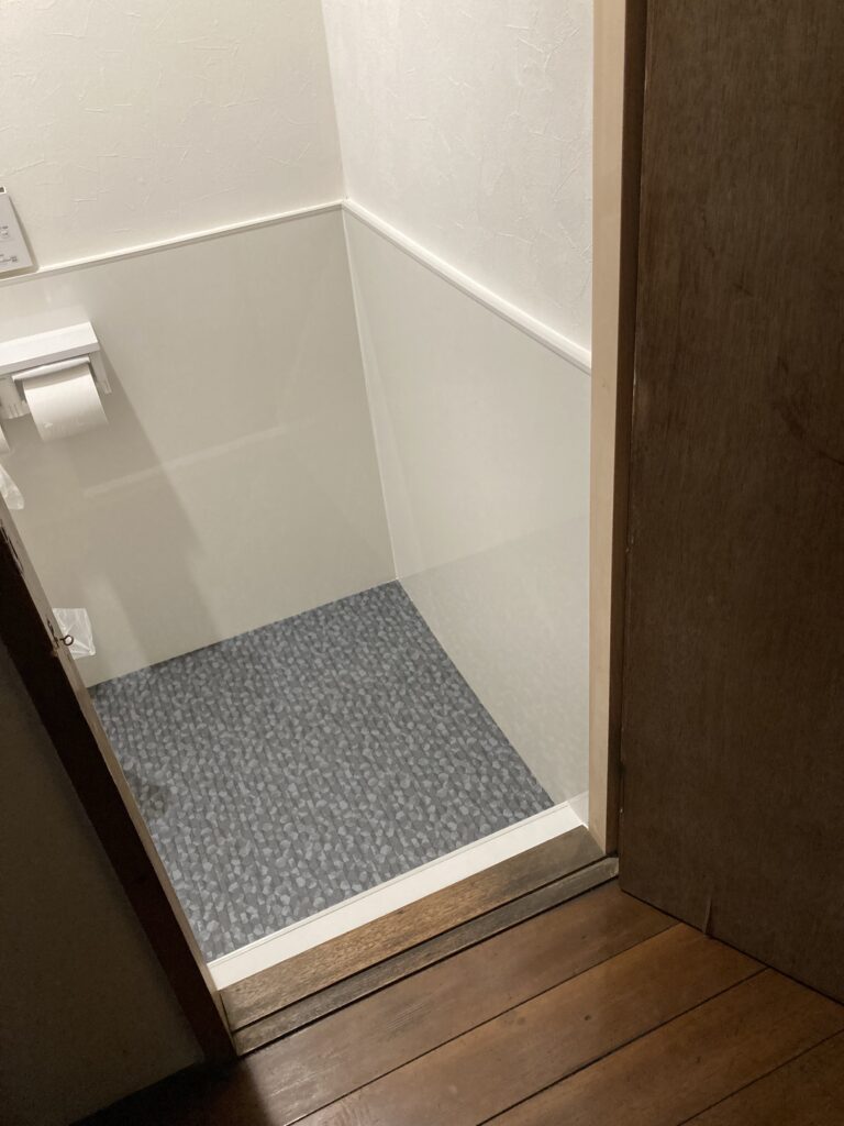 タイルの上に化粧パネルを貼りました。床の模様はグレー基調で、壁紙は白でまとめています。