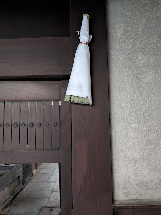 なかなか入手が困難な「長刀鉾」の粽をいただいたので、飾ることにしました。飾る場所は建物の入口、大戸の外「玄関」に飾るのですが、この夏からしばらく改修工事があるので「内玄関」の上に飾ることにしました。