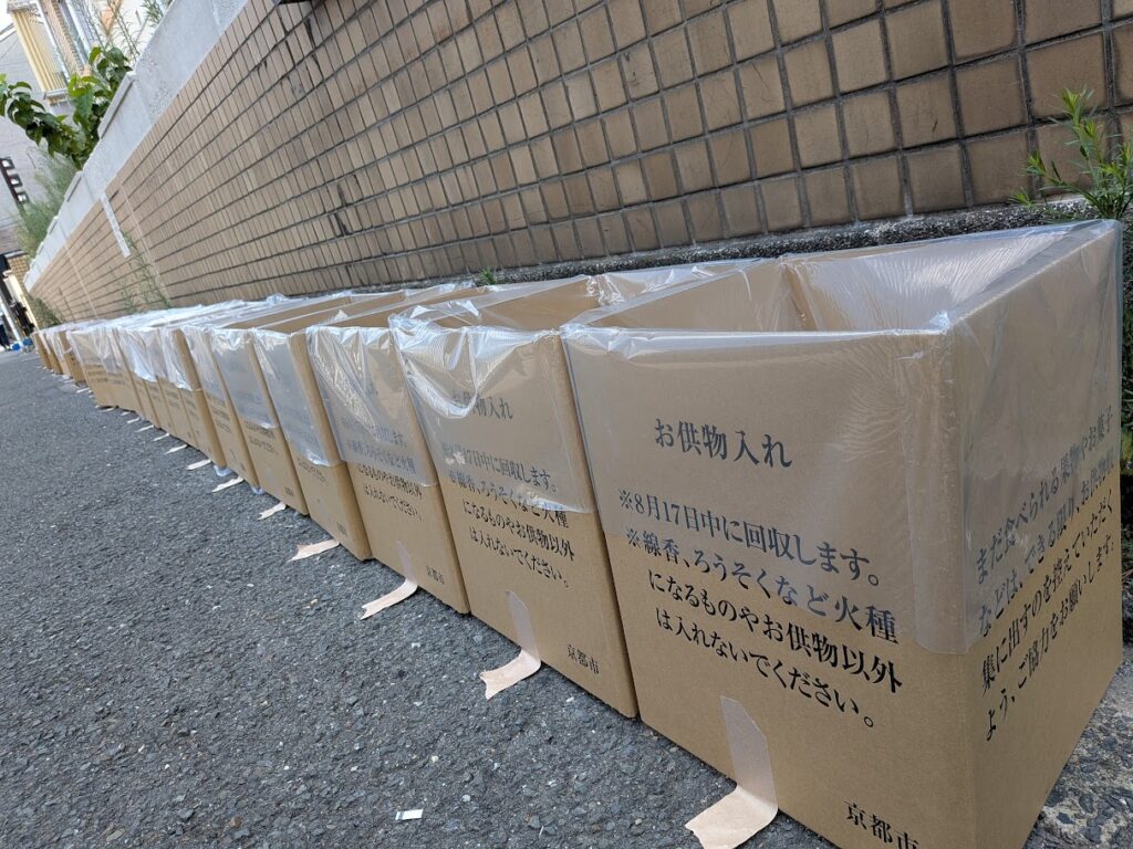 お精霊送り後のお供え物は川に流すのが本来なのですが、我が家の前にはお供えを改修する箱が設置されます。