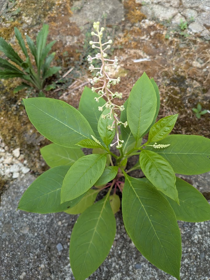これはヤマゴボウ。京都の町中で「山ゴボウ」が芽を出しています。これ実と根は猛毒です。黒い実がなった時にワンコが食べないか心配になりますが、新芽は食用になります。
