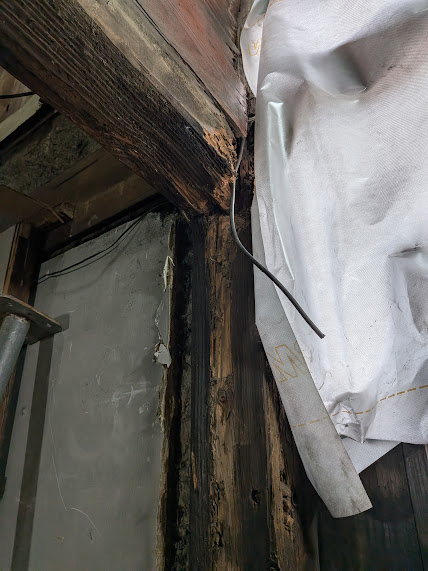 雨が吹き込んで虫に食われたのだろうか?お隣が駐車場になったことが起因しているかもしれません。