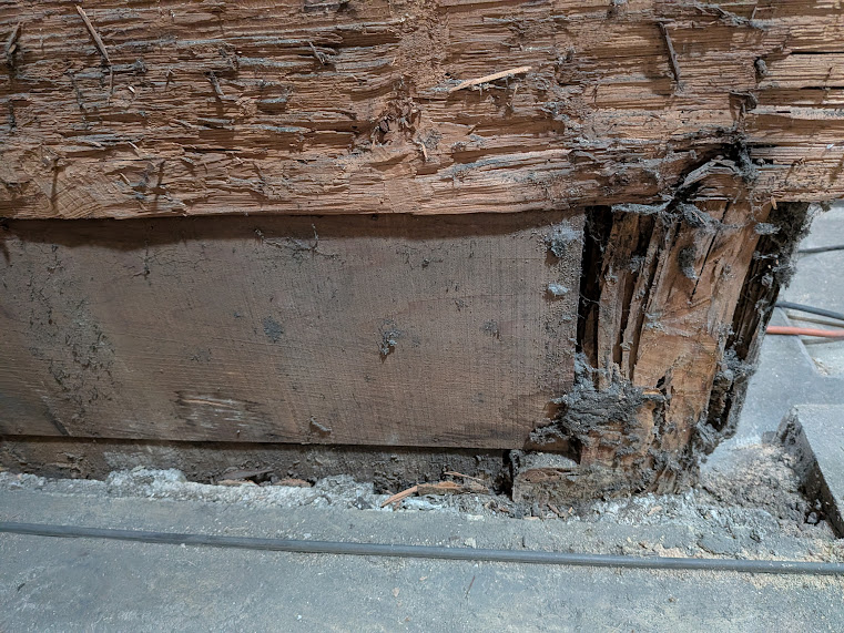 こちらは床部分。虫食いが進んでいます。原因は床上げのためにコンクリートを流し込んだため。すべてやり変えるそうです。