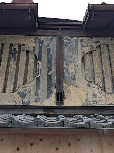 「おがみ看板」の跡をみると古いしっくい壁が現れました。これをみると創建時のしっくい壁は「ねずみ色」だったと思いがちですが、どうもそうではないようです。この鼠色のくすみは煤を被ったためで、火災にあった痕跡ではないかとのことです。他にも炭化した柱が出てきたとののことから小規模な失火を二階部分で経験しているようです。いろんな事実が明らかになります。