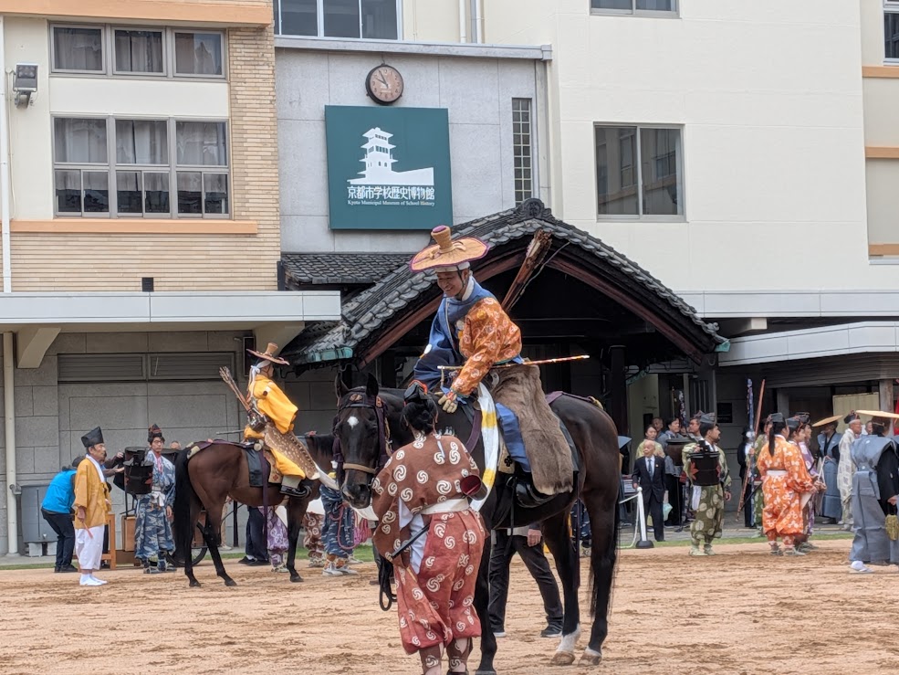 これは「城南流鏑馬列」という「分隊」で、今年がわが町内が当番担当で早朝からお迎えの旧開智小学校(学校歴史博物館)で衣装合わせや、乗馬訓練を行い町内をグルーと回って時代祭のスタート地点まで行進ということです。
