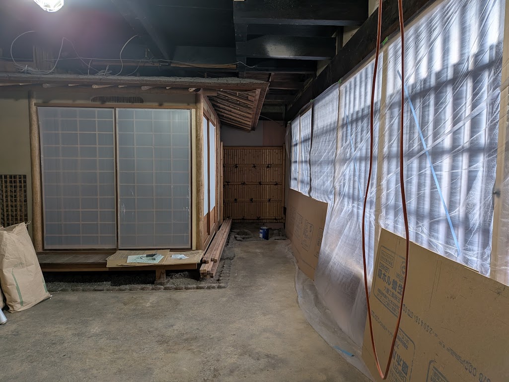 ガラス戸が入り、天井の造作物の整理などを進めていきます。