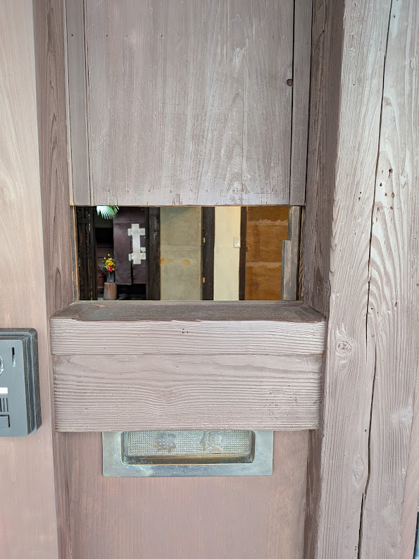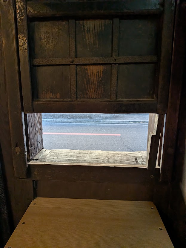 商品を受け渡すために設けられた窓のようです。戸口を開けることなくこの窓を通して物の受け渡しができます。