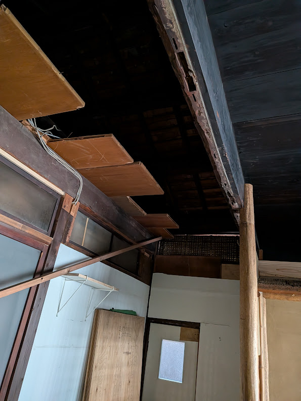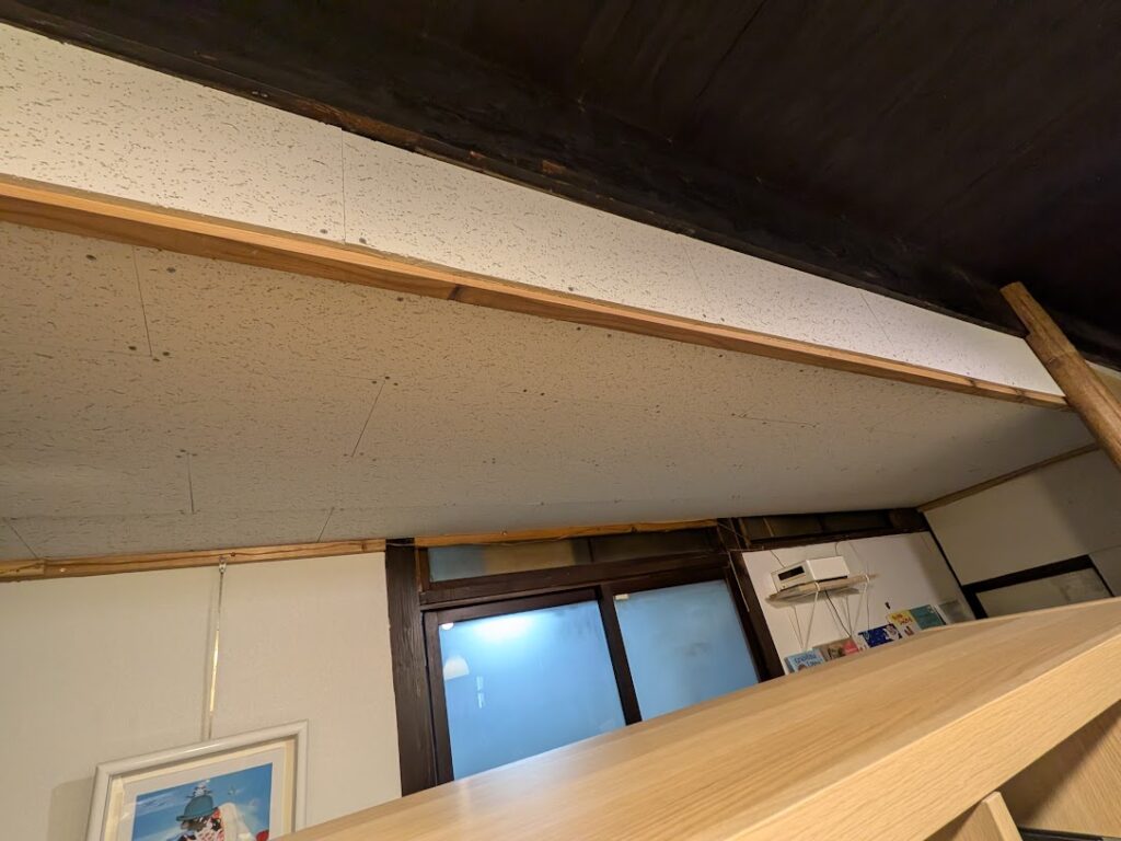もともとは屋根裏が丸みで状態です。古民家を売りにするならばこれも良いかもしれませんが、エアコンの利きが悪く、見た目がよくありません。当初べニアを貼ってクロスで仕上げようかと考えていたのですが、吉野石膏から軽くて扱いやすく値段も安いものを見つけトライしました。