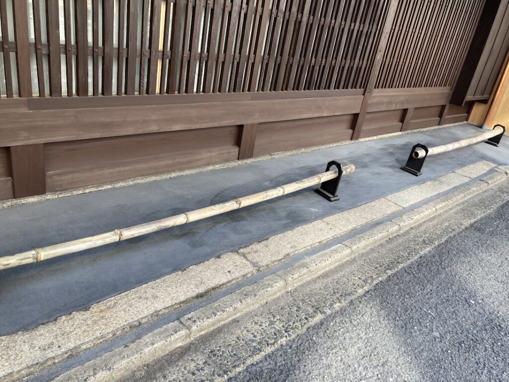 以前あった鉄製の駒寄せを撤去しました。店先を駐車スペースとして使わないようにしたいので、簡易な結界を設けています。