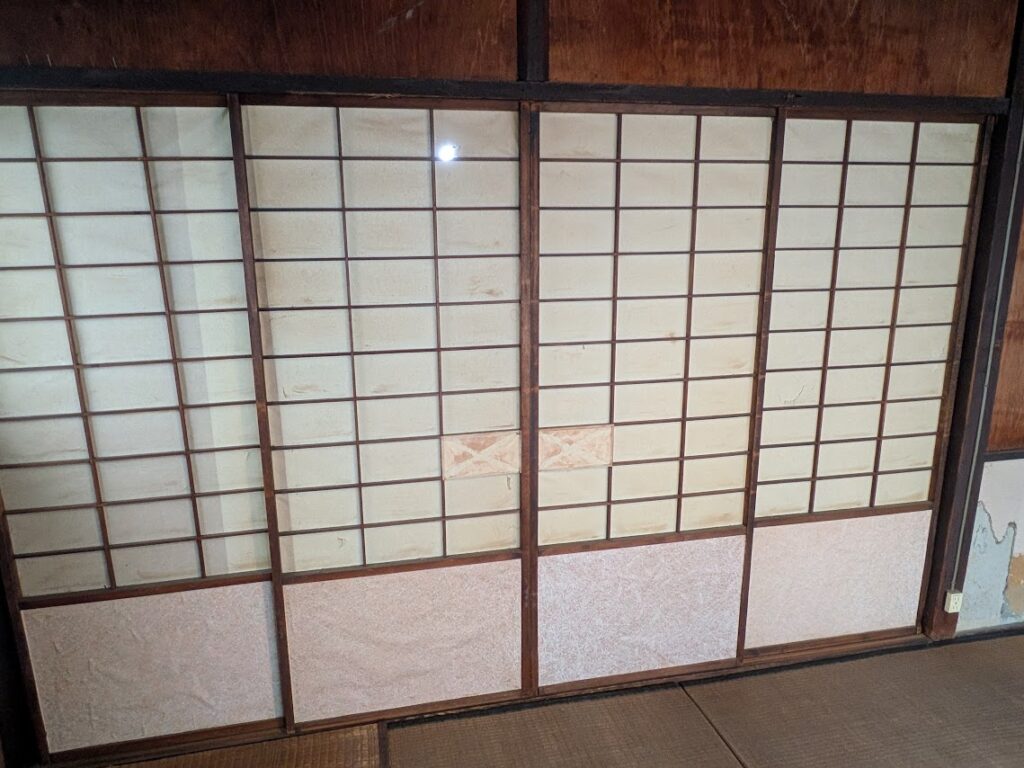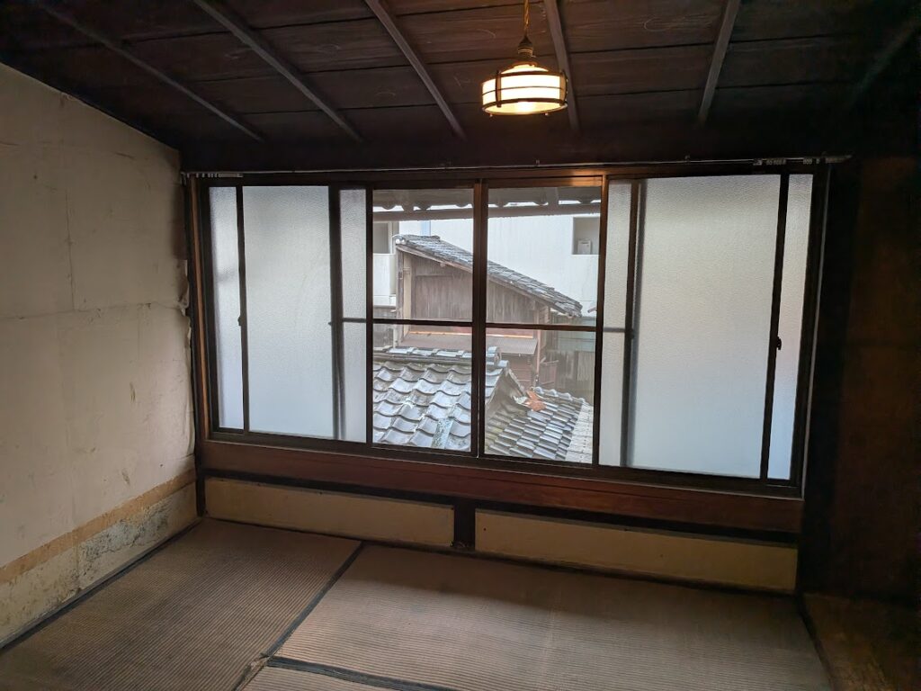 物置になっていた母屋の二階の片づけをしました。といっても、ものを整理整頓してみただけです。閉め切っていた雨戸をあけてみると、明るい部屋だと気づきます。畳、壁が傷み少し手を加えないといけません。