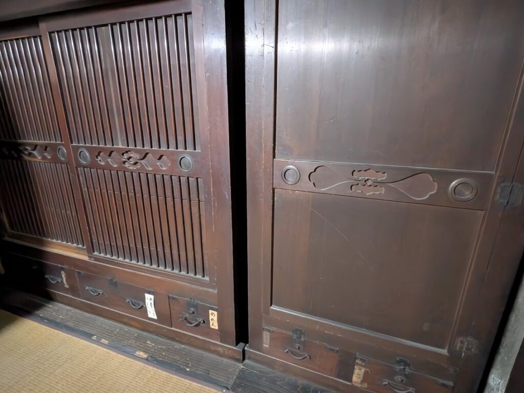 昭和な物入れもあるのですが多くは明治、大正のころのタンス、長持がたくさん残っていました。手の込んだ仕事です。